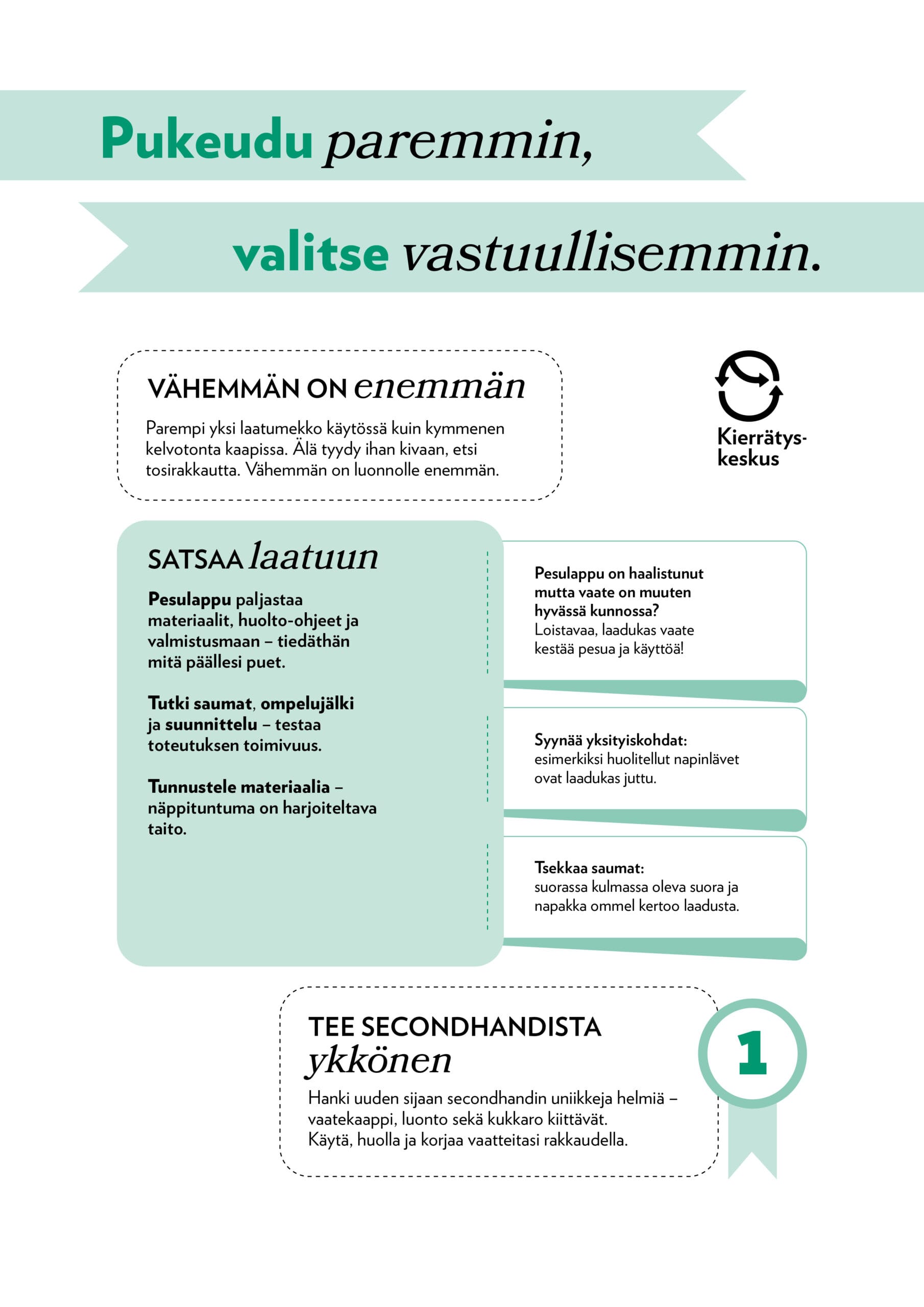 Blogi Vastuulliset vaatteet: Maailma vaatekaapissasi Miten valita vastuullisia vaatteita? Vaatteiden valmistaminen teettää paljon työtä ja kuluttaa arvokkaita luonnonvaroja. Vaatteemme ovat todellisia maailmankansalaisia: ne kulkevat tuotannon eri vaiheissa lukemattomien käsiparien kautta ympäri maailmaa. Tuotannon varjopuolet, ympäristöhaitat ja työmäärä eivät kuitenkaan näy meille vaatteen käyttäjille. Kulutamme vaatteita valtavia määriä, varsinkin koska heikkolaatuiset tekstiilit päätyvät nopeasti roskikseen. Jokaisen meistä tulisi toimia vastuullisesti ja uskaltaa uida vastavirtaan pintamuodin kiihtyvän kulutuksen virrassa. Kuinka se tehdään? Unohtamalla vastuuttomat vaatteet. Onneksi vastuullisten ja kestävien ratkaisujen tekeminen on kuitenkin helppoa ja mukavaa! Yksinkertaista ohjenuoraa noudattamalla säästät aikaa, rahaa, hermoja ja luontoa, sillä sen myötä sinulla on aina laadukasta ja kaunista päällepantavaa. Oletko valmis? Tässä se tulee! Hanki harkiten Luota laatuun Käytä kierrätettyä Hanki harkiten Vaatteen valmistus kuluttaa väistämättä luonnonvaroja, vaatteen laadusta riippumatta. Laatu kestää kuitenkin käytössä ja laatuvaatteen voi luovuttaa hyväkuntoisena jopa kierrätykseen, jolloin kulutetut luonnonvarat eivät mene hukkaan. Hanki siis harkiten ja luota laatuun – se on ekoteko! Shoppailuvimmassa rohmutut vaatteet saattavat muuttua nopeasti ankeiksi turhakkeiksi. Vältä ostosmorkkis ja hanki vain harkiten. Muista myös säilyttää, käyttää ja huoltaa vaatteitasi rakkaudella!Vaatekaappi kannattaa pitää järjestyksessä. Siisti, monikäyttöisiä vaatteita sisältävä kaappi houkuttelee pukeutumaan ja sinun tarvitsee yhä harvemmin kääntyä vaatekaupan puoleen. Luota laatuun Huonolaatuinen vaate kulahtaa muutaman käyttökerran jälkeen, mutta hyvistä materiaaleista huolellisesti valmistettu laatuvaate kestää parhaimmillaan sukupolvelta toiselle, säilyen aina yhtä kauniina. Vaatteen valmistus kuluttaa väistämättä luonnonvaroja huolimatta siitä, onko vaate laadukas vai ei. Laadukkaassa vaatteessa luonnonvarat eivät kuitenkaan mene hukkaan, sillä laatuvaate voidaan korjata pienellä vaivalla tai luovuttaa hyvillä mielin kierrätykseen. Kuinka sitten tunnistat laatuvaatteen jo kaupassa? Mistä tiedät, että vaate tulee kestämään? Laatu on monimuotoinen käsite eikä sen tunnistaminen ole aina helppoa. Siksipä olemme koonneet avuksesi vinkkejä kokonaisen kaapillisen verran! Tutustu sähköiseen laatuvaatekaappiin ja opi vinkit laatuvaatteen tunnistamiseen! Laatuvaatekaapin löydät myös Kierrätyskeskuksen Itäkeskuksen, Koivukylän ja Nihtisillan myymälöistä. Tutustu myös näihin: Kuituopas Vihreät vaatteet -opas Käytä kierrätettyä Vain laadukas vaate kestää uudelleenkäytön! Jos vaate on säilynyt Kierrätyskeskukseen asti siistinä, se todennäköisesti kestää kulutusta ja pesua pysyen hyvänä jatkossakin. Käytetty vaate on siis ikään kuin valmiiksi laatutestattu! Se on todennäköisesti myös vapaa kaikista kamalista valmistusprosessin kemikaaleista. Käytettyä hankkimalla voi säästää selvää rahaa – Kierrätyskeskuksesta voi kuka tahansa löytää arvokkaita ja laadukkaita vaatteita edullisesti. Kierrättämällä säästät sekä luontoa että kukkaroasi puhumattakaan siitä, että ostamalla käytettyä et tue lapsityövoimaa ja hikipajoja.Vanhoista, kierrätetyistä tekstiileistä voi myös ommella uutta. Jos uusien vaatteiden ompelu ei itseltäsi luonnistu, voit hyödyntää ompelijan palveluita tai vaikkapa Plan B:n uusiovaatteiden mallistoja. Maailma vaatekaapissasi -opetuspaketti Tutkimusmatka: Maailma vaatekaapissasi -opetuspaketti vie oppilaan maailmanympärysmatkalle yhdessä hänen valitsemansa vaatteen kanssa. Mitä kyseinen vaatekappale on kokenut ja kuinka monta käsiparia ympäri maailmaa on osallistunut vaatteen valmistusprosessiin? Miten vaatevalinnat vaikuttavat ympäristöön ja maailmaan, jossa elämme? Mitä tapahtuu vaatteelle sen jälkeen, kun sitä ei enää käytetä? Tutkimusmatka suoritetaan Kierrätyskeskuksen myymälässä, joko Espoon Nihtisillan tavaratalossa tai Helsingin Itäkeskuksen kaupalla. 60 minuuttia tai 90 minuuttia kestävän tutkimusmatkan aikana oppilaat arvioivat myös omaa ostokäyttäytymistään ja heille annetaan työkaluja vastuullisempaan vaatesuhteeseen. Opetuspaketti on tarkoitettu yläkoululaisista ylöspäin. Opetuspaketin avulla opiskelijat pääsevät toiminnallisesti tutustumaan tekstiiliin liittyviin teemoihin ja saavat tilaisuuden pohtia omia tapojaan vaikuttaa. Lukuvinkki Planetaarinen vaatekaappi Sissi Penttilä, Aku Varamäki2024 Kuinka monta vaatetta voi ostaa vuodessa niin että yksi planeetta riittää? Haalimme aina vain lisää vaatteita, ja samaan aikaan luemme uutisia jätevuorista, kasvavista päästöistä ja romahtavista tehtaista. Emme osaa pitää huolta vaatteistamme emmekä erota tarvetta mieliteosta. Silmiä avaava tietokirja pureutuu vaateteollisuuden ongelmiin ja niiden ratkaisuihin. Se neuvoo, kuinka pukeutua maapallon kantokyvyn rajoissa ilosta ja tyylistä tinkimättä, ja antaa konkreettisia työkaluja parempaan vaatearkeen. Artikkeli julkaistu 07.12.2020 Jaa artikkeli Anu Hakala Ympäristöasiantuntija • Ekokompassi-ympäristöjärjestelmän neuvonta ja auditointi • Ympäristötyön kehittäminen • Asiantuntijaluennot • Ympäristökoulutukset • Kierrätyskeskuksen ympäristövastuutyö anu.hakala@kierratyskeskus.fi Puh. 045 636 630