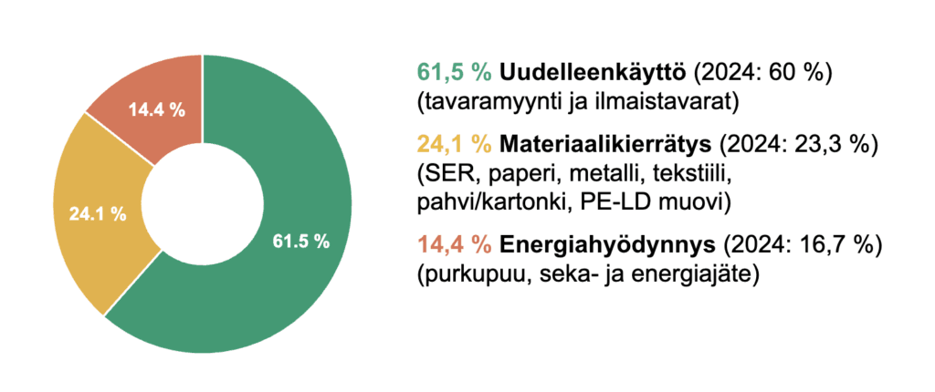 Kierrätyskeskuksen kautta kiersi uudelleenkäyttöön 9 miljoonaa tavaraa, joista 56 % myytiin ja 44 % jaettiin ilmaiseksi.